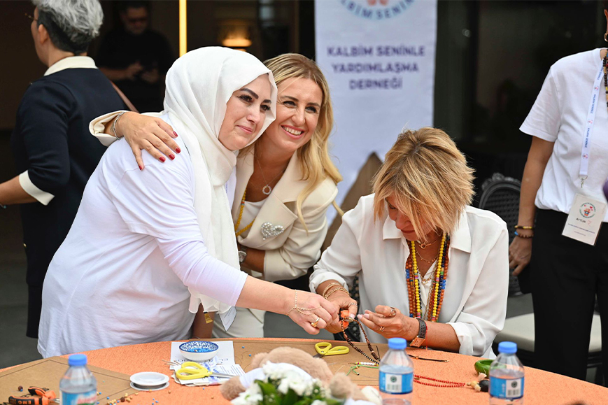 Kalbim Seninle Yardımlaşma Derneği’nin burs fonu yararına düzelenlediği İyilik Atölyesi’nde gazeteci-yazar Ayşe Arman kadınlarla birlikte kolye yaptı.